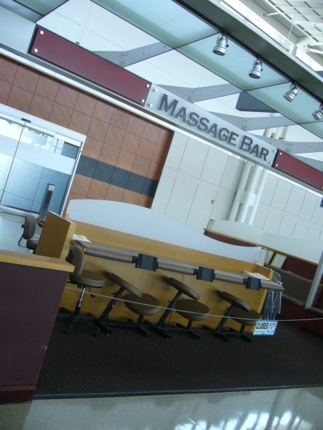 空港の中 両サイドにお店があって センターにテーブルといす 小さなワゴンショップが出ています