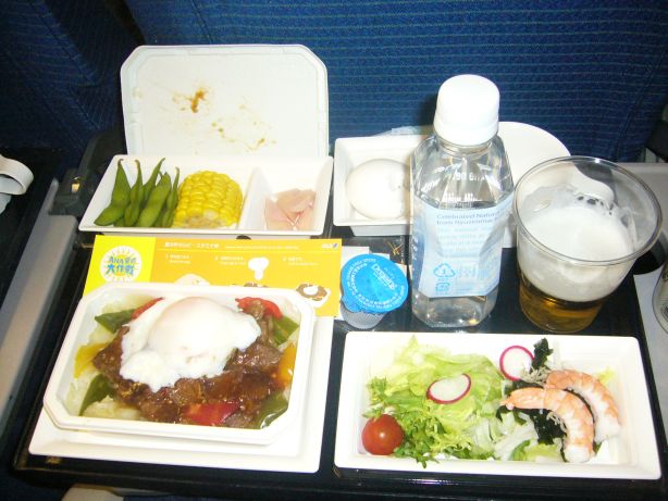 夫はビールをもらっています なんと全日空はアルコール無料です