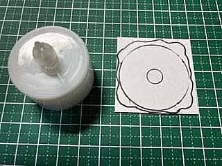 100均で手に入るLEDライトを使います 厚紙やプラ板などに台座部分の型を取り、 周りをわざといびつにカットし、 中心にライトのカバーが通る穴を開けます |