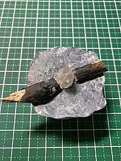 カットしたベースに色を塗ります 灰のイメージで灰色、白、黒をあまり水をつけずに トントンという感じで乗せていくと雰囲気が出ます 絵の具が乾いたらライトにはめ込み、薪に見立てた小枝と 炎のパーツを接着していきます |