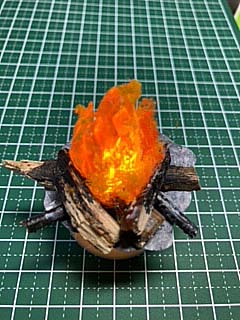 | スタイロフォームなどで作る場合、くり抜きも比較的楽なのでこのように埋め込んで 使えますし、LEDライト本体の周りに直接粘土で形を盛り付けて 屋外での焚火のような情景も作れます(参考作品は2点ともスタイロフォームを使っています) |